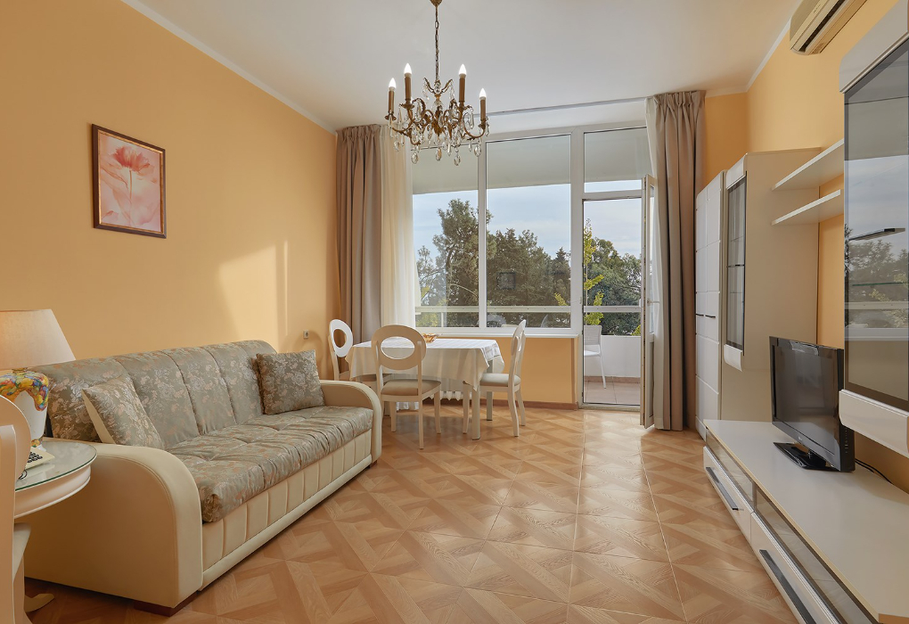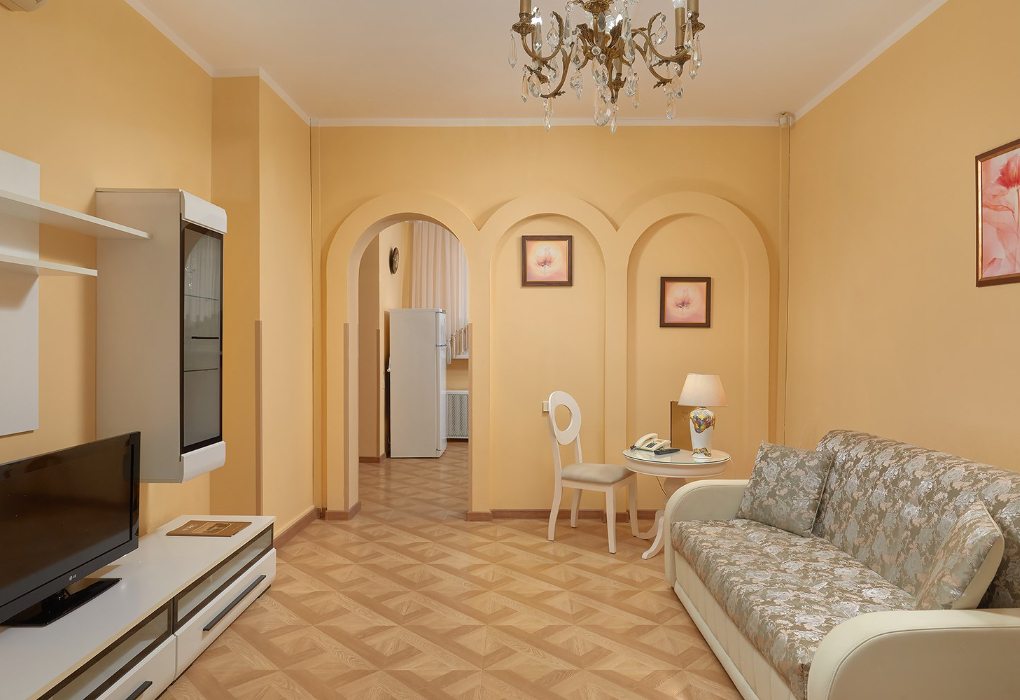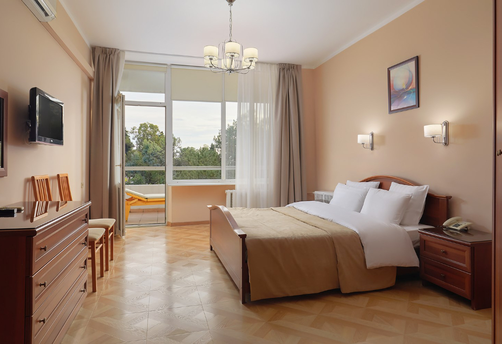 Площадь номера - 56 кв.м. 2 комнаты. 2 осн. места. Вид на море. Подарок клиенту при заезде: фруктовая корзина, минеральная вода, чай, кофе, конфеты.. В номере: телевизор; кондиционер; телефон; ванна; фен; набор посуды; сейф; халаты; туалетные принадлежности; 2-спальная кровать; кресло; тумбочки; зеркало; стол; вешалка для одежды; мини-холодильник; чайник; стулья; шкаф; санузел. 2 доп. места: