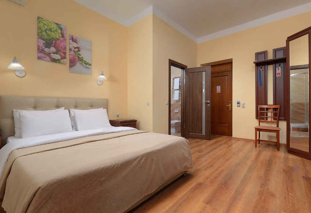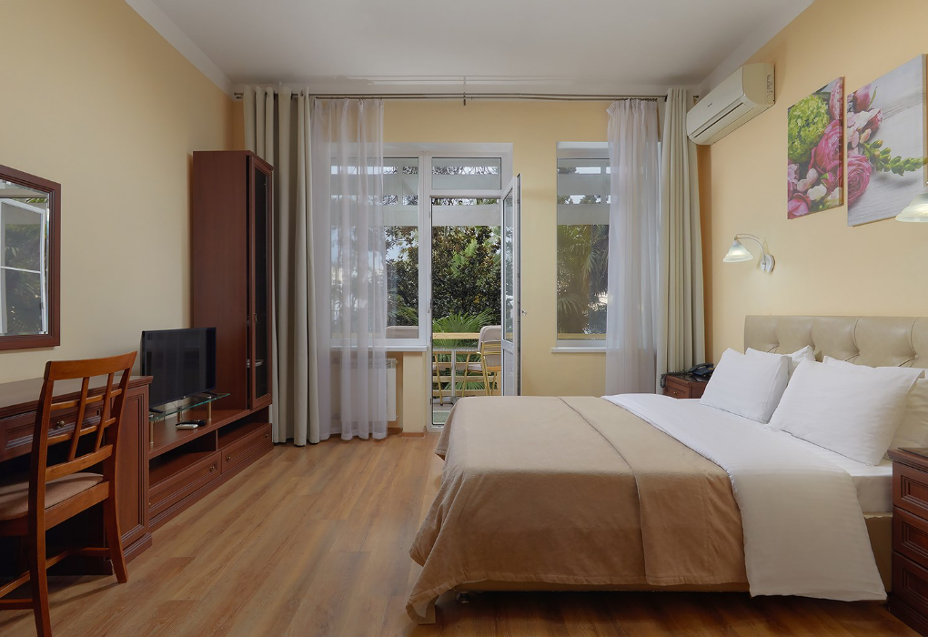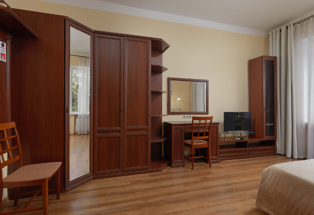 Площадь номера - 16 кв.м. 1 комната. 2 осн. места. В номере: телевизор; холодильник; кондиционер; телефон; набор посуды; сейф; туалетные принадлежности; 2-спальная кровать; тумбочки; стол; чайник; душевая кабина; шкаф; санузел. 1 доп. место: