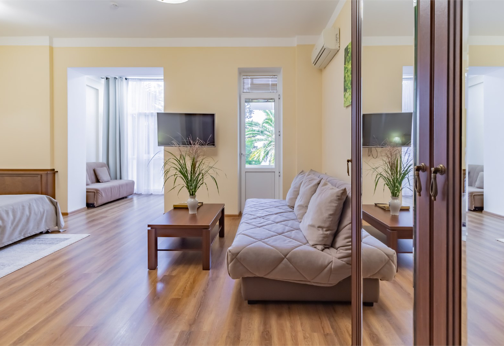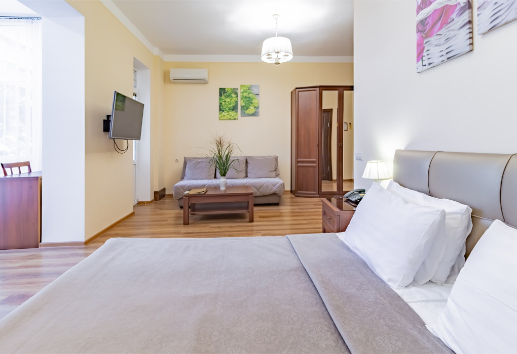 Площадь номера - 33 кв.м. 1 комната. 2 осн. места. Просторный зонированный номер с балконом и частичным видом на море на 2 этаже. В номере 2 дивана. Подарок клиенту при заезде: фруктовая корзина, минеральная вода, чай, кофе, конфеты.. В номере: телевизор; холодильник; кондиционер; телефон; фен; сейф; халаты; тапочки; туалетные принадлежности; стул; 2-спальная кровать; стол; душевая кабина; шкаф; санузел. 3 доп. места: